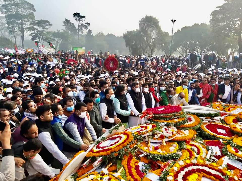 এবং মহান বিজয় দিবস উপলক্ষে জাতীয় স্মৃতিসৌধে বাংলাদেশ আওয়ামী লীগের পুষ্পার্ঘ্য নিবেদন করা হয়। মুক্তিযুদ্ধ ও স্বাধীনতার প্রশ্নে কোনো আপস নয় জানিয়ে আওয়ামী লীগের সাধারণ সম্পাদক ও সেতুমন্ত্রী ওবায়দুল কাদের বলেছেন, দেশে একদিকে সাম্প্রদায়িকতা, আরেকদিকে অসাম্প্রদায়িকতার দুটি ধারা চলছে। একদিকে ৪৭-এর চেতনা, অন্যদিকে ৭১-এর চেতনা। বিজয়ের এই দিনে আমাদের শপথ হবে সাম্প্রদায়িক অপশক্তি যে বিষবৃক্ষ, ডালপালা বিস্তার করেছে; সেই বিষবৃক্ষকে সমূলে উৎপাটন করে সাম্প্রদায়িক অপশক্তিকে রুখে দেয়ার মাধ্যমে বঙ্গবন্ধুর স্বপ্নের সোনার বাংলা বিনির্মাণ করা।