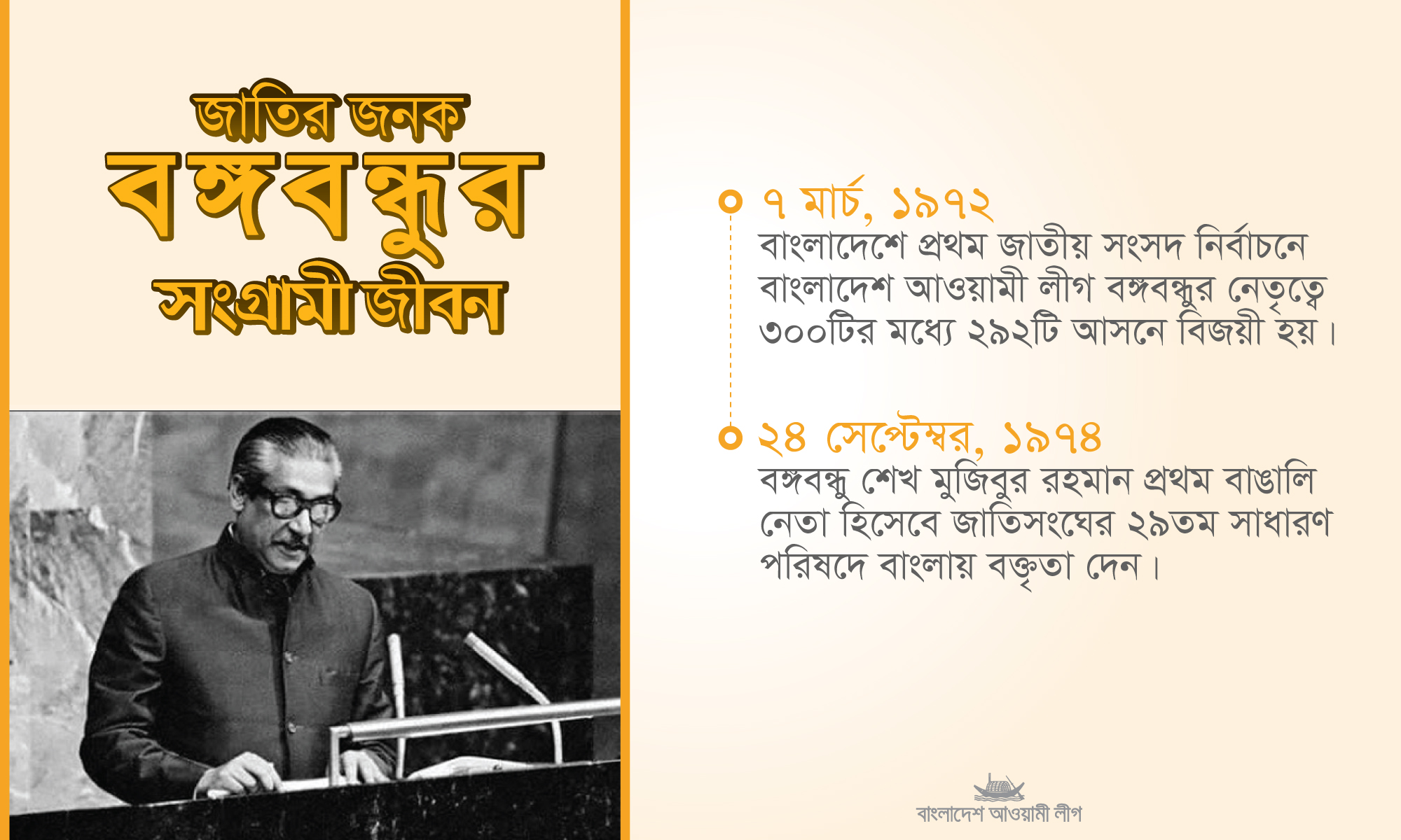 ৭ মার্চ, ১৯৭২ : বাংলাদেশে প্রথম জাতীয় সংসদ নির্বাচনে বাংলাদেশ আওয়ামী লীগ বঙ্গবন্ধুর নেতৃত্বে ৩০০টির মধ্যে ২৯২টি আসনে বিজয়ী হয়। ২৪ সেপ্টেম্বর, ১৯৭৪ : বঙ্গবন্ধু শেখ মুজিবুর রহমান প্রথম বাঙালি নেতা হিসেবে জাতিসংঘের ২৯তম সাধারণ পরিষদে বাংলায় বক্তৃতা দেন।