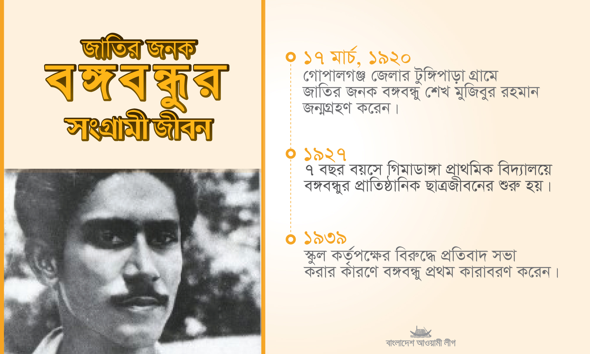 ১৭ মার্চ, ১৯২০: গোপালগঞ্জ জেলার টুঙ্গিপাড়া গ্রামে জাতির জনক বঙ্গবন্ধু শেখ মুজিবুর রহমান জন্মগ্রহণ করেন। ১৯২৭: ৭ বছর বয়সে গিমাডাঙ্গা প্রাথমিক বিদ্যালয়ে বঙ্গবন্ধুর প্রাতিষ্ঠানিক ছাত্রজীবনের শুরু হয়। ১৯৩৯: স্কুল কর্তৃপক্ষের বিরুদ্ধে প্রতিবাদ সভা করার কারণে বঙ্গবন্ধু প্রথম কারাবরণ করেন।