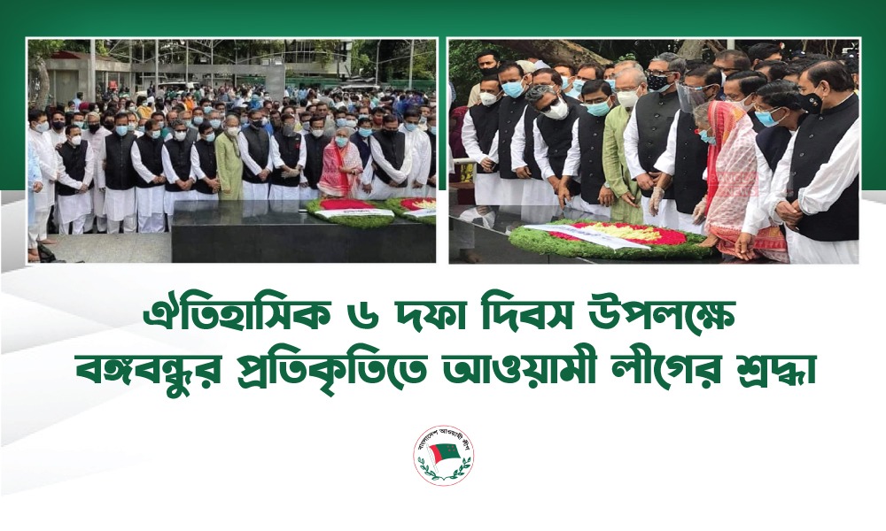 ঐতিহাসিক ছয় দফা দিবস উপলক্ষে আজ সোমবার রাজধানীর ধানমন্ডির ৩২ নম্বর সড়কে বঙ্গবন্ধু ভবনের সামনে রক্ষিত জাতির পিতা বঙ্গবন্ধু শেখ মুজিবুর রহমানের প্রতিকৃতিতে শ্রদ্ধা নিবেদন করেছে আওয়ামী লীগসহ বিভিন্ন সংগঠন। দিবসটি উপলক্ষে সকালে প্রধানমন্ত্রী শেখ হাসিনার পক্ষে আওয়ামী লীগের সাধারণ সম্পাদক এবং সড়ক পরিবহন ও সেতুমন্ত্রী ওবায়দুল কাদের বঙ্গবন্ধুর প্রতিকৃতিতে শ্রদ্ধাঞ্জলি...