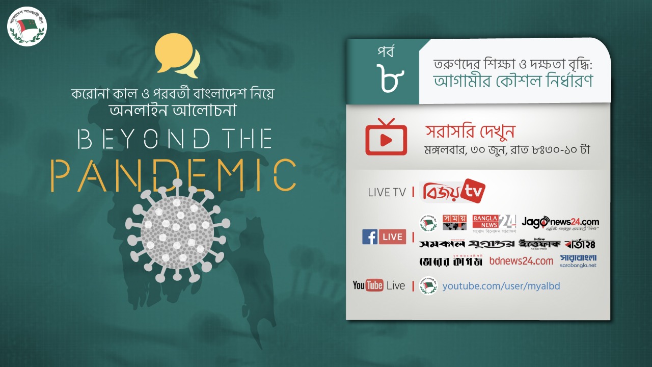 করোনাকাল ও পরবর্তী বাংলাদেশ নিয়ে আওয়ামী লীগের বিশেষ ওয়েবিনার 'Beyond the Pandemic' এর ষষ্ঠ পর্ব প্রচারিত হয় ১৬ জুন রাত ৮.৩০ মিনিটে।এই পর্বের বিষয় ছিল বাজেট ২০২০-২০২১: জীবন ও জীবিকার বাজেট। আলোচক হিসেবে ছিলেন এম এ মান্নান, এমপিমন্ত্রী, পরিকল্পনা মন্ত্রণালয় টিপু মুনশি এমপিমন্ত্রী, বাণিজ্য মন্ত্রণালয় নসরুল হামিদ, এমপিপ্রতিমন্ত্রী বিদ্যুৎ, জ্বালানি ও খনিজ সম্পদ মন্ত্রণ...