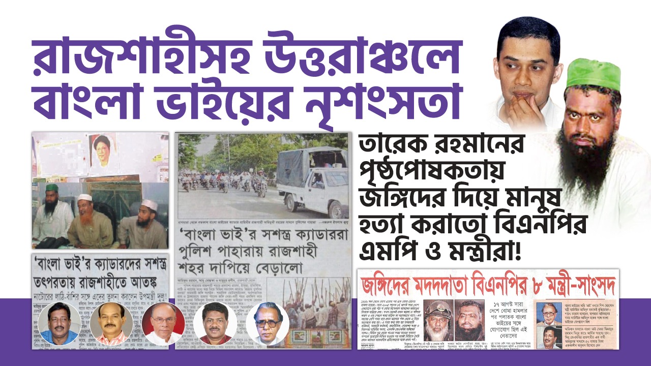 উগ্রবাদী জঙ্গিদের প্রকাশ্য হত্যাযজ্ঞ ও বর্বরতায় আতঙ্কের নগরীতে পরিণত হয়েছিল রাজশাহী, নাটোর, নওগাঁসহ উত্তরাঞ্চলের একটা বিস্তীর্ণ এলাকা। পরবর্তীতে তত্ত্ববধায়ক সরকারের সময় কুখ্যাত জঙ্গি বাংলা ভাই ও তার সহযোগী শায়খদের ফাঁস হয়। কিন্তু বিএনপি-জামায়াত জোট সরকার তাদের হত্যাযজ্ঞকে শুধু অস্বীকারই করেনি, উল্টো প্রশাসনিক সহায়তা ও টাকা দিয়ে বিরোধীদের দমনে ব্যবহার করতো তাদের। তত্ত্ববধ...