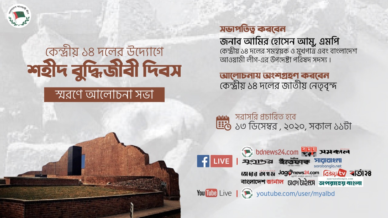আগামী ১৩ ডিসেম্বর ২০২০ রবিবার সকাল ১১টায় কেন্দ্রীয় ১৪ দলের উদ্যোগে ভার্চুয়াল পদ্ধতিতে (Zoom Online-এর মাধ্যমে) শহীদ বুদ্ধিজীবী দিবস স্মরণে এক আলোচনা সভা অনুষ্ঠিত হবে। সভায় সভাপতিত্ব করবেন কেন্দ্রীয় ১৪ দলের সমন্বয়ক ও মুখপাত্র এবং বাংলাদেশ আওয়ামী লীগ-এর উপদেষ্টা পরিষদ সদস্য জনাব আমির হোসেন আমু এমপি। সভায় বক্তব্য রাখবেন কেন্দ্রীয় ১৪ দলের জাতীয় নেতৃবৃন্দ। অনুষ্ঠানটি সরা...