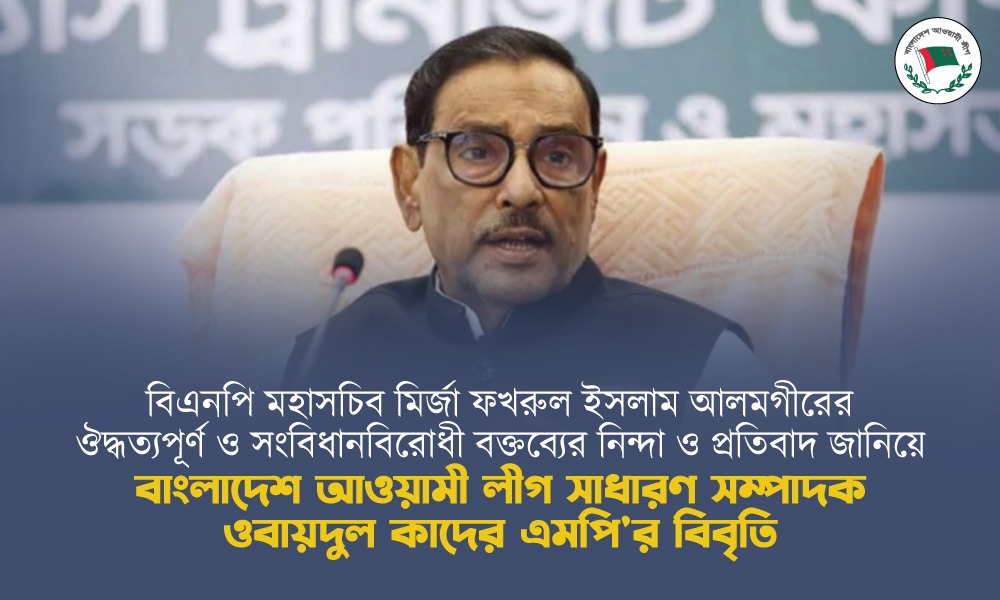বাংলাদেশ আওয়ামী লীগ সাধারণ সম্পাদক এবং গণপ্রজাতন্ত্রী বাংলাদেশ সরকারের সড়ক পরিবহন ও সেতু মন্ত্রণালয়ের মাননীয় মন্ত্রী ওবায়দুল কাদের এমপি আজ এক বিবৃতিতে বিএনপি মহাসচিব মির্জা ফখরুল ইসলাম আলমগীরের দুরভিসন্ধিমূলক, কুরুচিপূর্ণ ও বিভ্রান্তিকর বক্তব্যের নিন্দা ও প্রতিবাদ জানিয়েছেন। বিবৃতিতে আওয়ামী লীগ সাধারণ সম্পাদক বলেন, বিএনপির নেতিবাচক কর্মকাণ্ডের প্রতি জনগণের কোনো আগ্র...