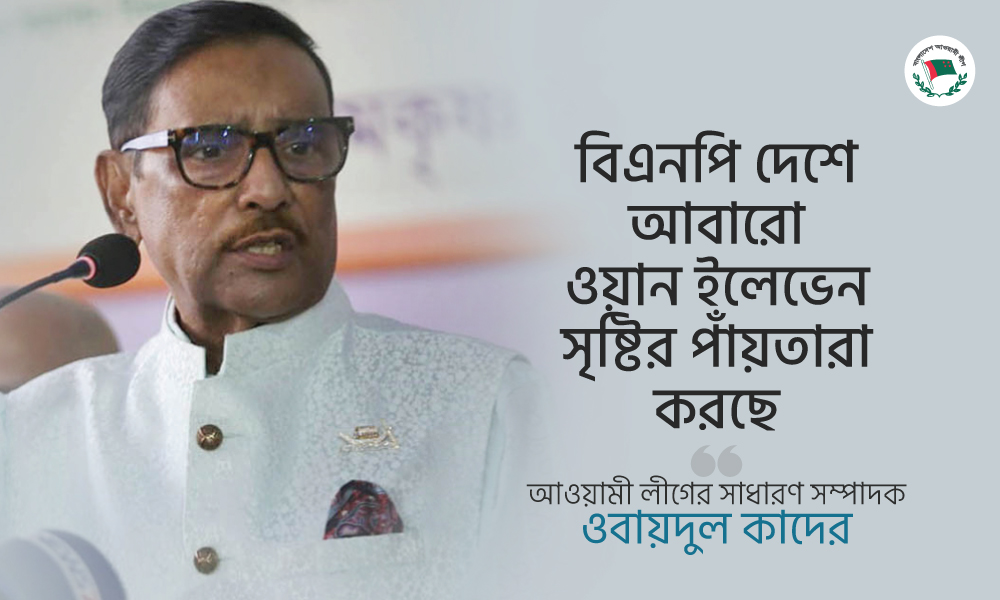 আওয়ামী লীগের সাধারণ সম্পাদক এবং সড়ক পরিবহন ও সেতুমন্ত্রী ওবায়দুল কাদের বলেছেন, ষড়যন্ত্রের মাধ্যমে চোরাগলি পথে ক্ষমতায় যেতে বিএনপি দেশে আবারো ওয়ান ইলেভেন সৃষ্টির পাঁয়তারা করছে। আজ শনিবার বিকেলে আওয়ামী লীগের সভাপতির ধানমন্ডির রাজনৈতিক কার্যালয়ে দলের সম্পাদকমন্ডলীর সঙ্গে ঢাকা মহানগর দক্ষিণ ও উত্তর আওয়ামী লীগ এবং সহযোগী সংগঠনের সভাপতি-সম্পাদকদের অনুষ্ঠিত এক যৌথসভায়...