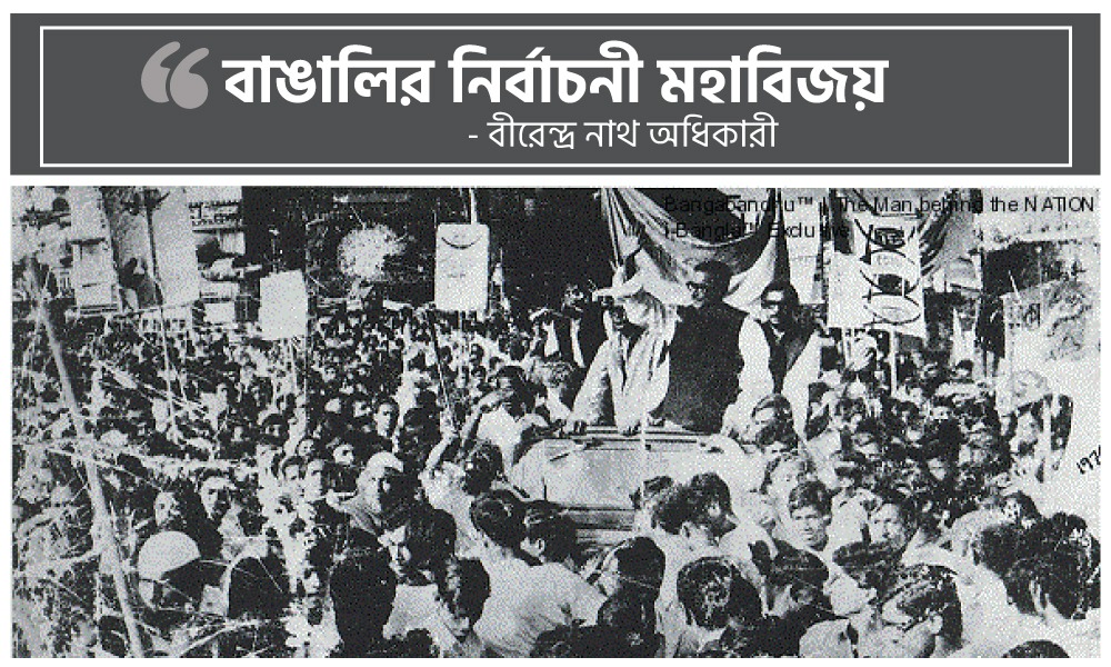বীরেন্দ্র নাথ অধিকারীঃ আগামী ১৬ ডিসেম্বর বাঙালির মহান বিজয়ের ৪৯তম বছর এবং ৫০তম বিজয় দিবস। এই চূড়ান্ত বিজয়ের সোপান তৈরি করেছিল ১৯৭০ সালের ৭ ডিসেম্বর অনুষ্ঠিত তৎকালীন পাকিস্তানের প্রথম সাধারণ নির্বাচন। সেই নির্বাচনে বাঙালিদের ভূমিধস বিজয়ের সুবর্ণজয়ন্তী এ বছর। কী করে বাঙালিদের অভূতপূর্ব এবং বিশ্ব-ইতিহাসে নজিরবিহীন বিজয় অর্জিত হয়েছিল; ঘটনা পরম্পরায় তার স্মৃতি রোমন্থ...