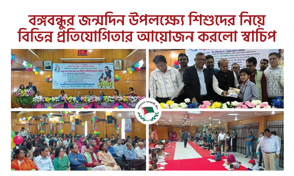 জাতির পিতা বঙ্গবন্ধু শেখ মুজিবুর রহমানের ১০৩তম জন্মবার্ষিকী ও জাতীয় শিশু দিবস উপলক্ষে স্বাধীনতা চিকিৎসক পরিষদের (স্বাচিপ) উদ্যোগে বঙ্গবন্ধুর জীবনীভিত্তিক শিশুদের উপস্থিত বক্তৃতা, কবিতা আবৃত্তি, সংগীত, অভিনয়, চিত্রাংকন প্রতিযোগিতা অনুষ্ঠিত হয়েছে। বৃহস্পতিবার (১৬ মার্চ) স্বাধীনতা চিকিৎসক পরিষদ (স্বাচিপ) কেন্দ্রীয় কমিটির সভাপতি ডা. মো. জামাল উদ্দিন চৌধুরীর সভাপতিত্বে বঙ্গব...